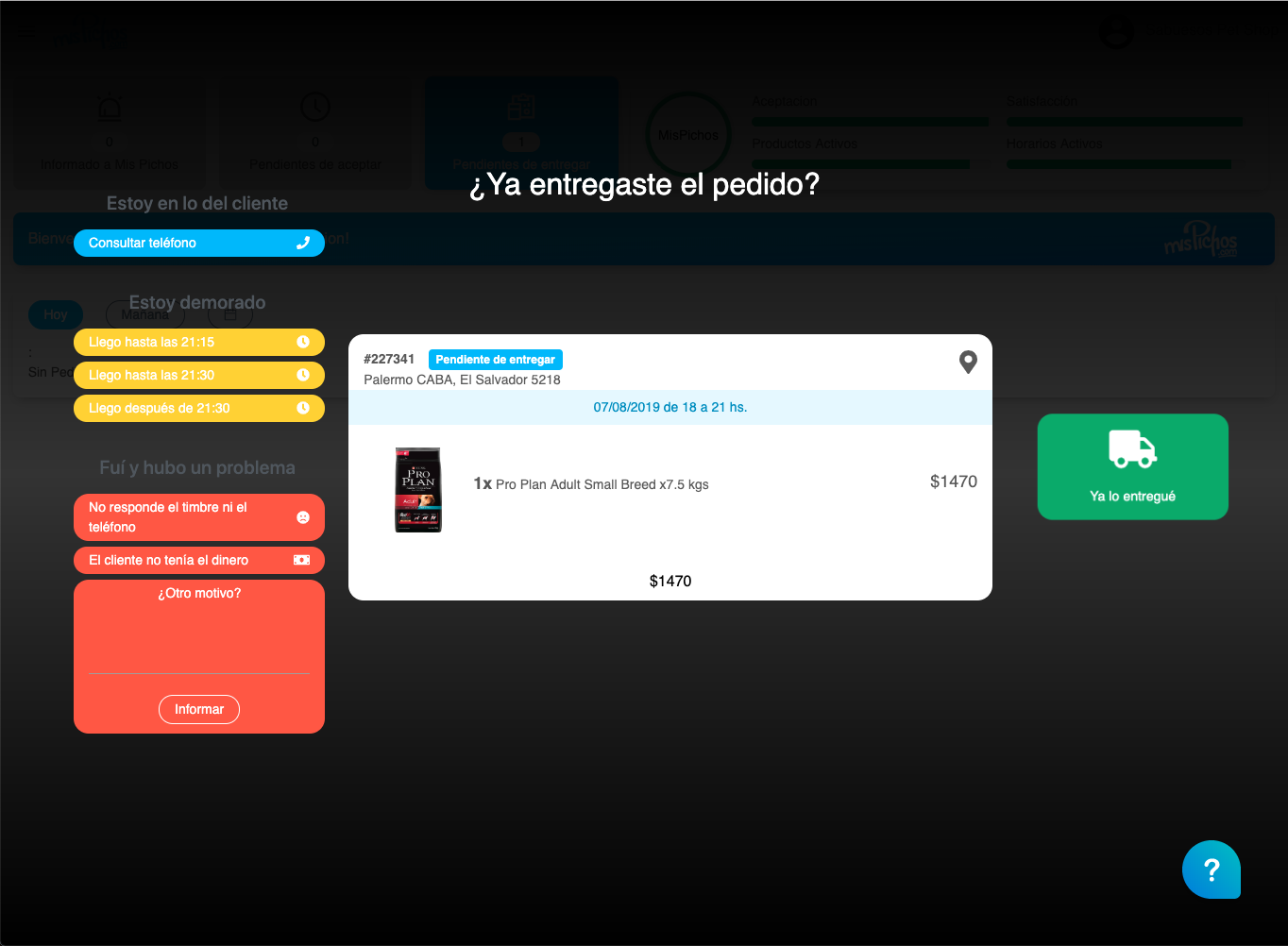 - Informados a MisPichos: Pedidos que fuiste a entregar y hubo un problema. Que esté en este estado implica que MisPichos debe tomar una acción.